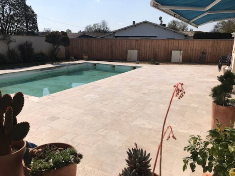 Nous avons procédé à la mise en place de travertin sur toute la surface de la terrasse de piscine, à savoir 115 m².